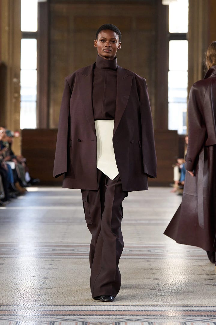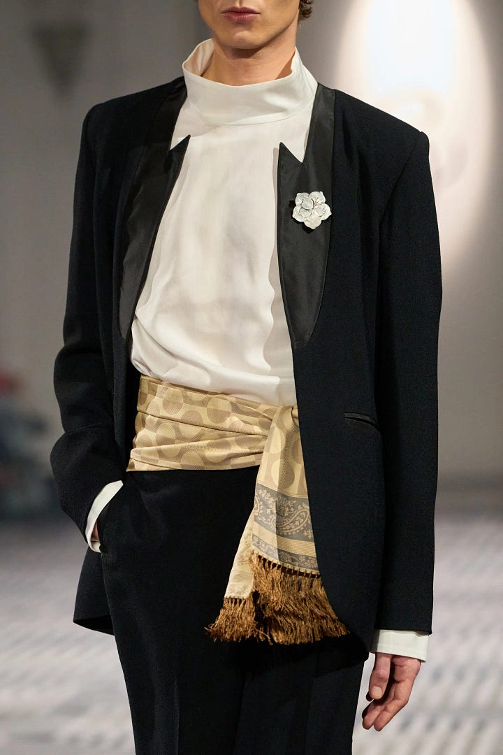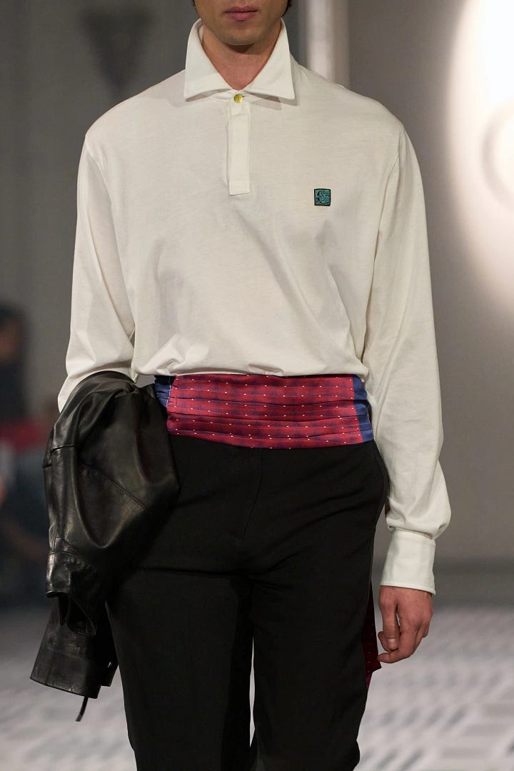 They’ve been making their way down the runways rather quickly. Notably, Conner Ives, Ralph Lauren, Carven, and Marni all featured cummerbunds, or cummerbund adjacent details in their recent collections.