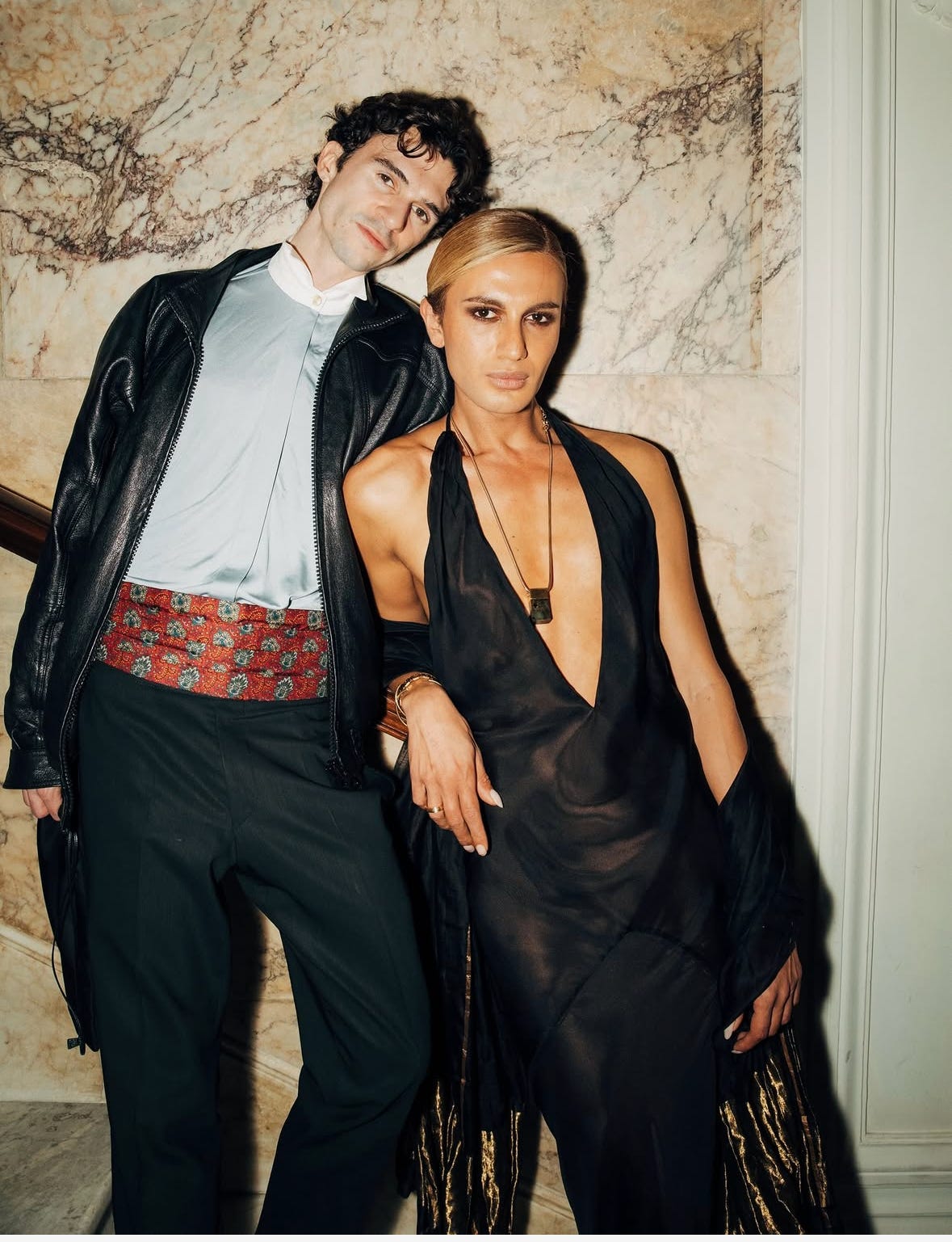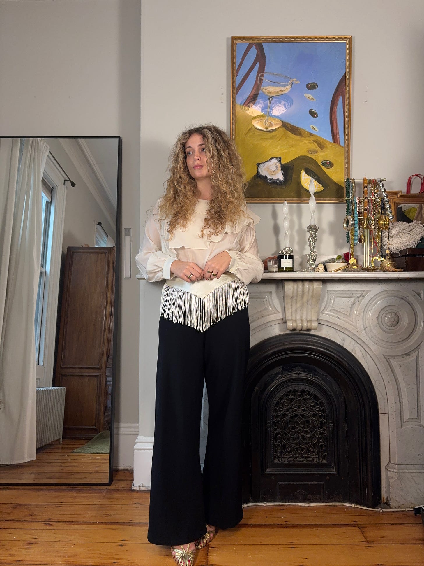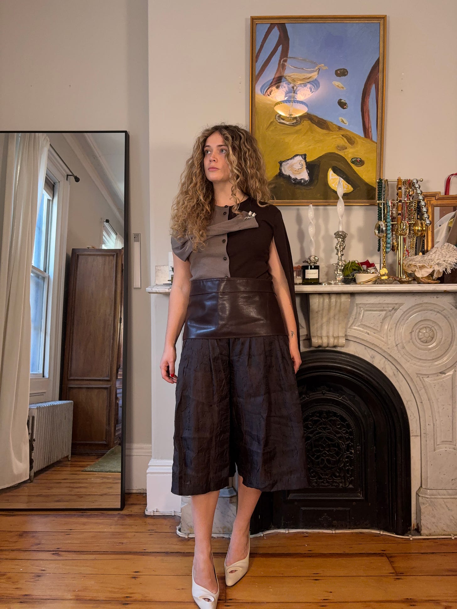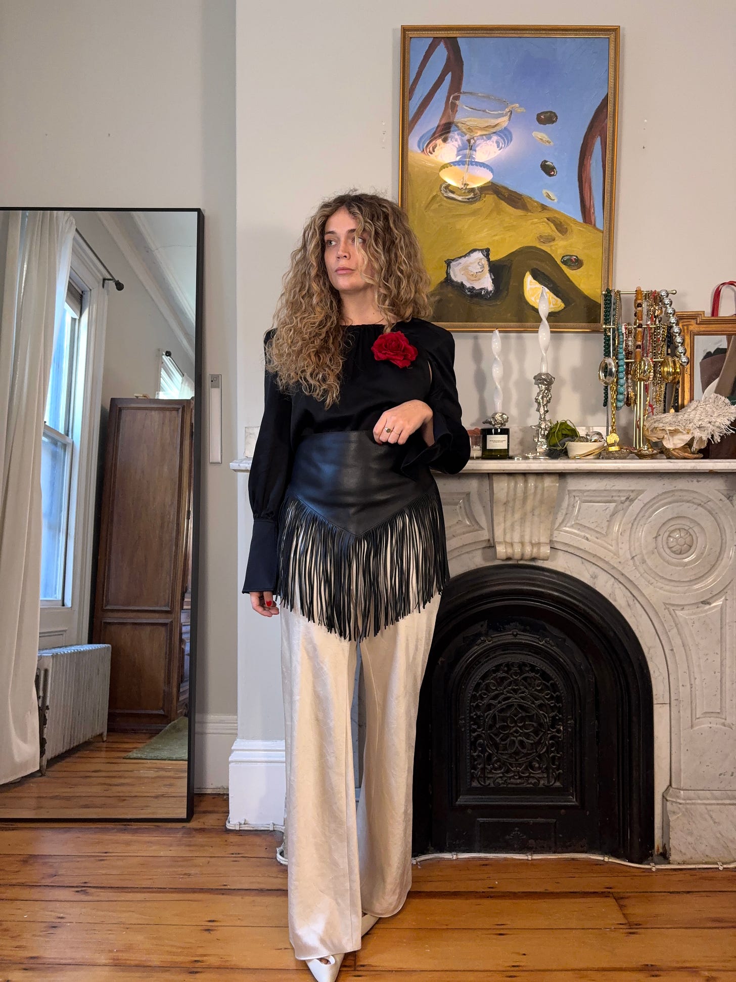Now onto styling. As I mentioned before, I like using the effect of a cummerbund to break an outfit into distinct sections while keeping the overall look cohesive. This leather fringe belt, in the first look, helps add texture and separate the black satin from the belt itself, while it more clearly splits up the look above through color blocking.